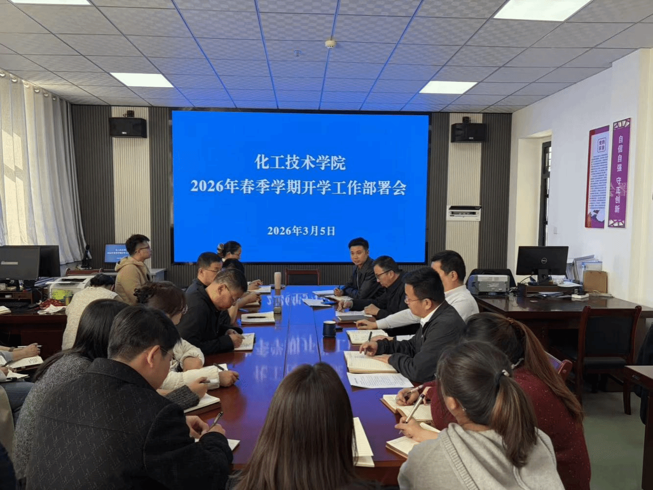 35日下午,化工技术学院召开2026年春季学期开学工作部署会,学院领导班子及全体教职工参会。会议以收心归位、压实责任、明确任务、狠抓落实为核心,统筹安排新学期学生管理、教学筹备等各项工作,同时围绕学院发展核心目标部署年度重点任务,为新学期教育教学工作开好局、起好步筑牢基础。