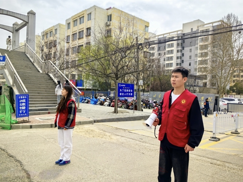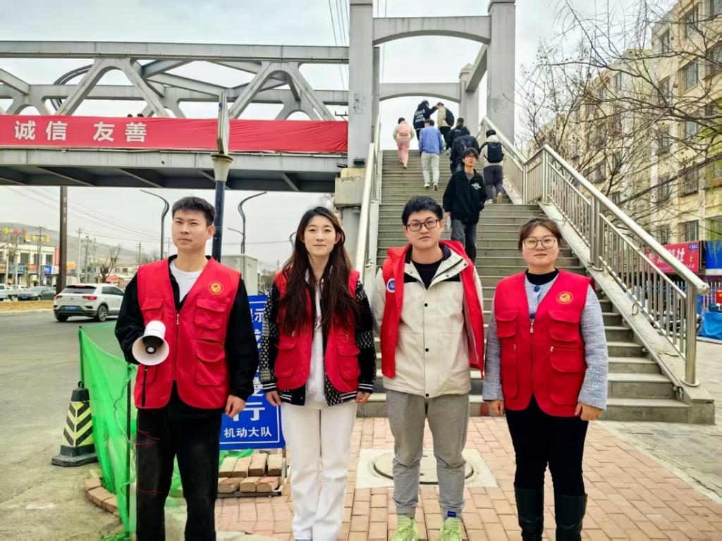 活动期间,志愿者们在中晚高峰时段驻守于学校中门、家属院门口等人流车流密集区域,依法开展文明交通劝导,耐心规劝行人走天桥过街,对电动车逆行、驾乘人员未佩戴头盔等违规现象实施柔性指导及普法宣教。通过将交通法规具象化为文明实践活动,切实增强师生交通安全意识,让“志愿红”成为路口最温暖的平安底色。