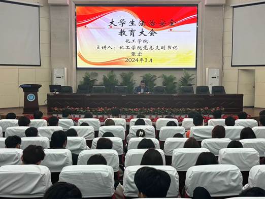 为进一步加强大学生法制观念和安全防范意识,提高自我保护能力,掌握安全防范技能,化工学院于2024年3月19日下午,在图书馆5楼报告厅召开法治安全教育大会,此次大会由化工学院党总支副书记张宏主持,化工学院辅导员以及全体在校学生参加。