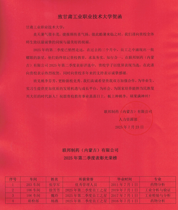 近日,化工学院荣幸地收到了来自联邦制药(内蒙古)有限公司的贺信。2011届毕业生张学军同学荣获“优秀管理人员”称号。2016届毕业生杨燕、2017届毕业生魏玲以及2019届毕业生徐芳芳等三名同学,荣获“2025年第二季度员工之星”称号。