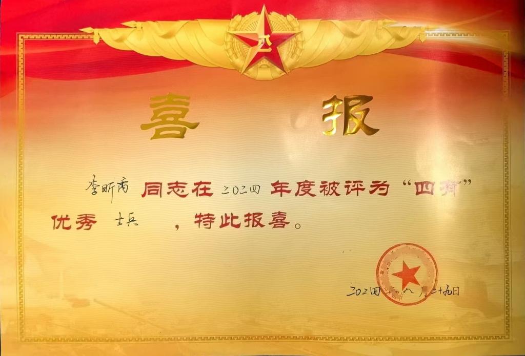 近日,学院收到来自部队的喜报,环测2031班学生李昕禹被所在部队评为2024年度“四有”优秀士兵。