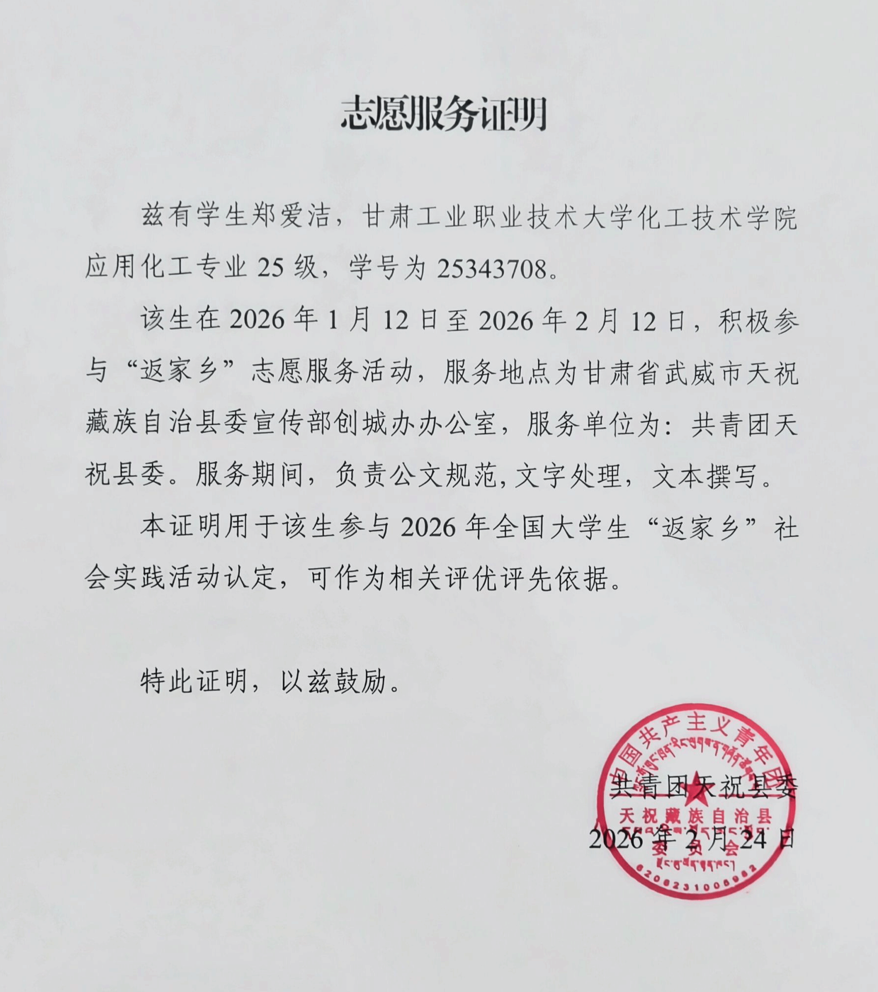 在实践期间,郑爱洁同学志于天祝县委宣传部创建文明城市指挥部办公室岗位进行学习与锻炼,主要承担公文规范化处理、文字材料整理与撰写等日常工作任务。她以严谨细致、勤奋好学的工作态度,积极协助完成创城资料的归档整理及宣传活动的协调推进,深入参与精神文明建设的基层实践,有效将课堂所学转化为服务家乡的实际能力。其认真负责的工作表现,得到了实习单位的高度认可。共青团天祝县委专门致函表扬,充分肯定她展现出的高度责任意识与服务精神,充分体现了当代大学生的良好精神风貌。