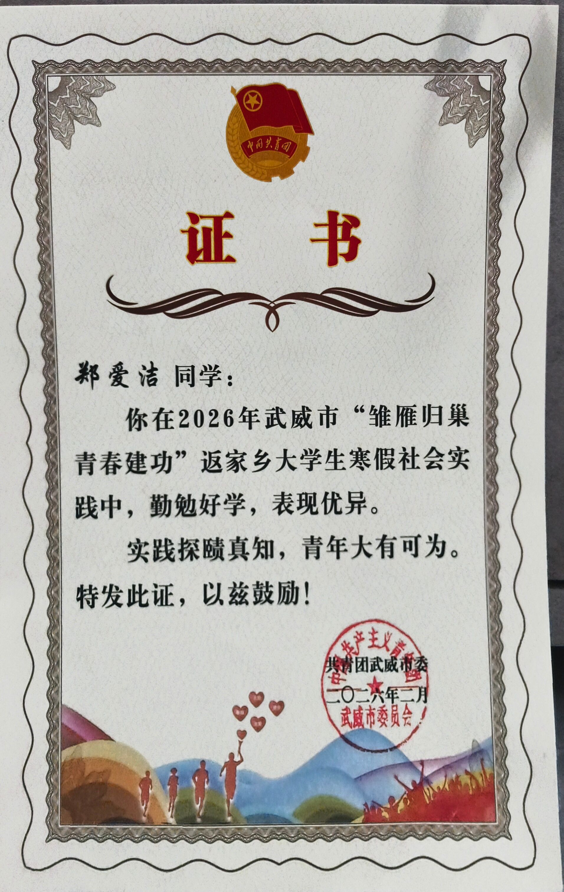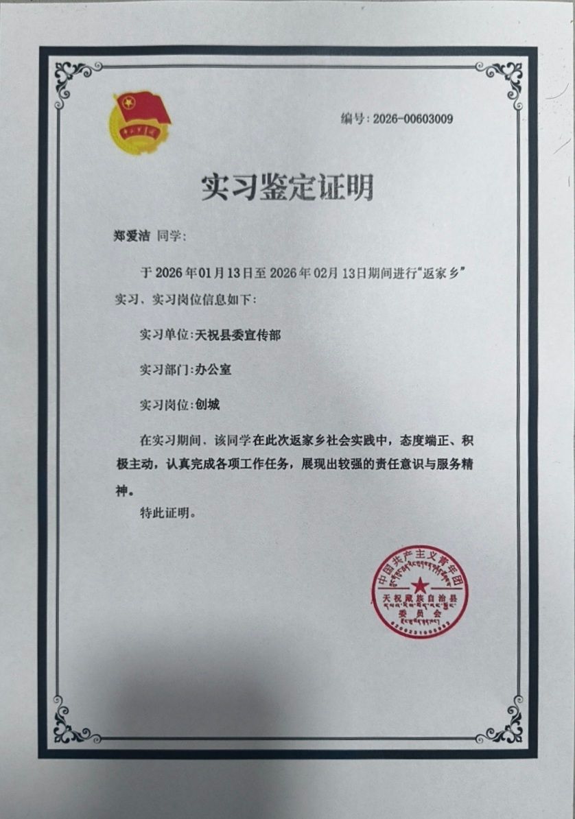 实践结束后,郑爱洁因表现优异,获共青团武威市委颁发“雏雁归巢 青春建功”社会实践优秀证书,其服务事迹被共青团天祝县委作为典型予以表彰。她表示,此次返家乡实践是一次珍贵的成长历练,不仅深切体会到基层工作的艰辛与价值,也进一步坚定了学好专业知识、服务社会发展的决心。